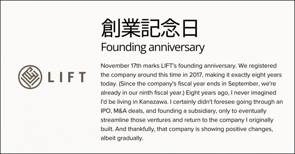 LIFT は現在 9 期目に入っているが、金沢に移転する前の 5 期と、移転後の 6 期目以降はまったく別の会社になっている。見方を変えればまだ 3 期が終わった程度の赤ちゃんのような会社で、一歩一歩は小さな歩みでしかない。