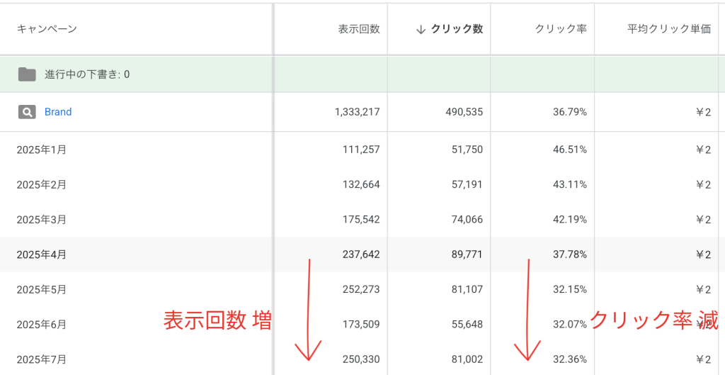 仮に単価が変わらなかったとしても、クリックの下落率よりも表示回数の増加率が高ければ、キャンペーンのコストは増えていく。(実際に上記の例でも 2025年 4月以前と比較すると指名の総費用が 2〜3割増えている)