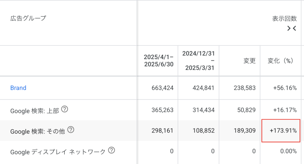 Google 広告の管理画面では、「分類」から「上部 vs その他」を選択することで広告掲載位置ごとのパフォーマンスを確認できるが、2025年4月以降、「その他」の表示回数が増加しているアカウントが多い。